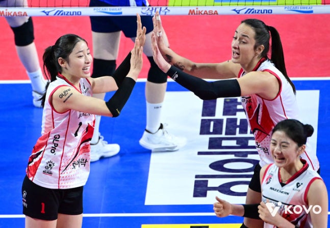 [서울=뉴시스] 여자 프로배구 정관장의 인쿠시(왼쪽)가 8일 화성종합실내체육관에서 열린 진에어 2025~2026 V-리그 여자부 IBK기업은행과의 경기에서 득점한 뒤 팀 동료 자네테와 기뻐하고 있다. (사진=KOVO 제공) 2026.01.08. *재판매 및 DB 금지