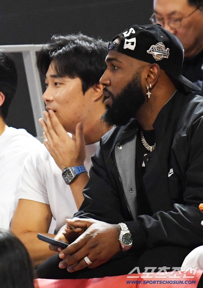 4일 잠실학생체육관에서 열린 프로농구 서울 SK와 부산 KCC의 경기. 메이저리그 애틀랜타 브레이브스 김하성이 팀 동료 마르셀 오주나와 농구를 즐기고 있다. 잠실=박재만 기자 [email protected]/2025.11.04/