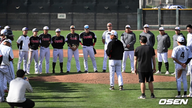[OSEN=애리조나(미국), 이대선 기자] 20일(한국시간) 미국 애리조나주 스코츠데일 인디언스쿨 파크 베이스볼필드에서 LG 트윈스의 스프링캠프가 진행되고 있다. LG 선수들이 김정준 수석 코치의 말을 듣고 있다. 2025.02.20 / [email protected]