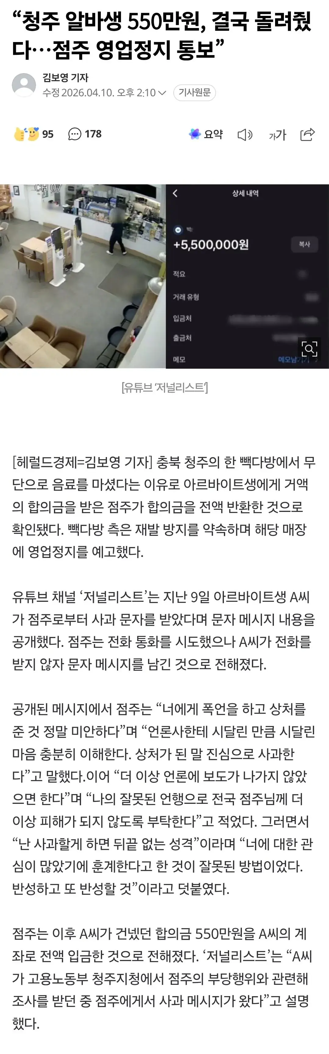 청주 알바생 550만원, 결국 돌려줬다…점주 영업정지 통보
