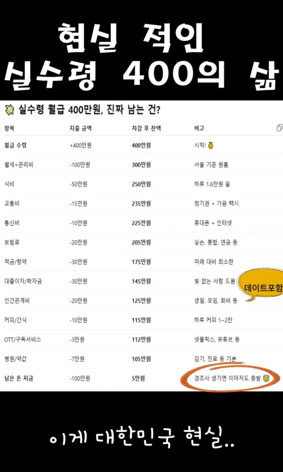 현실적인 실수령 400의 삶