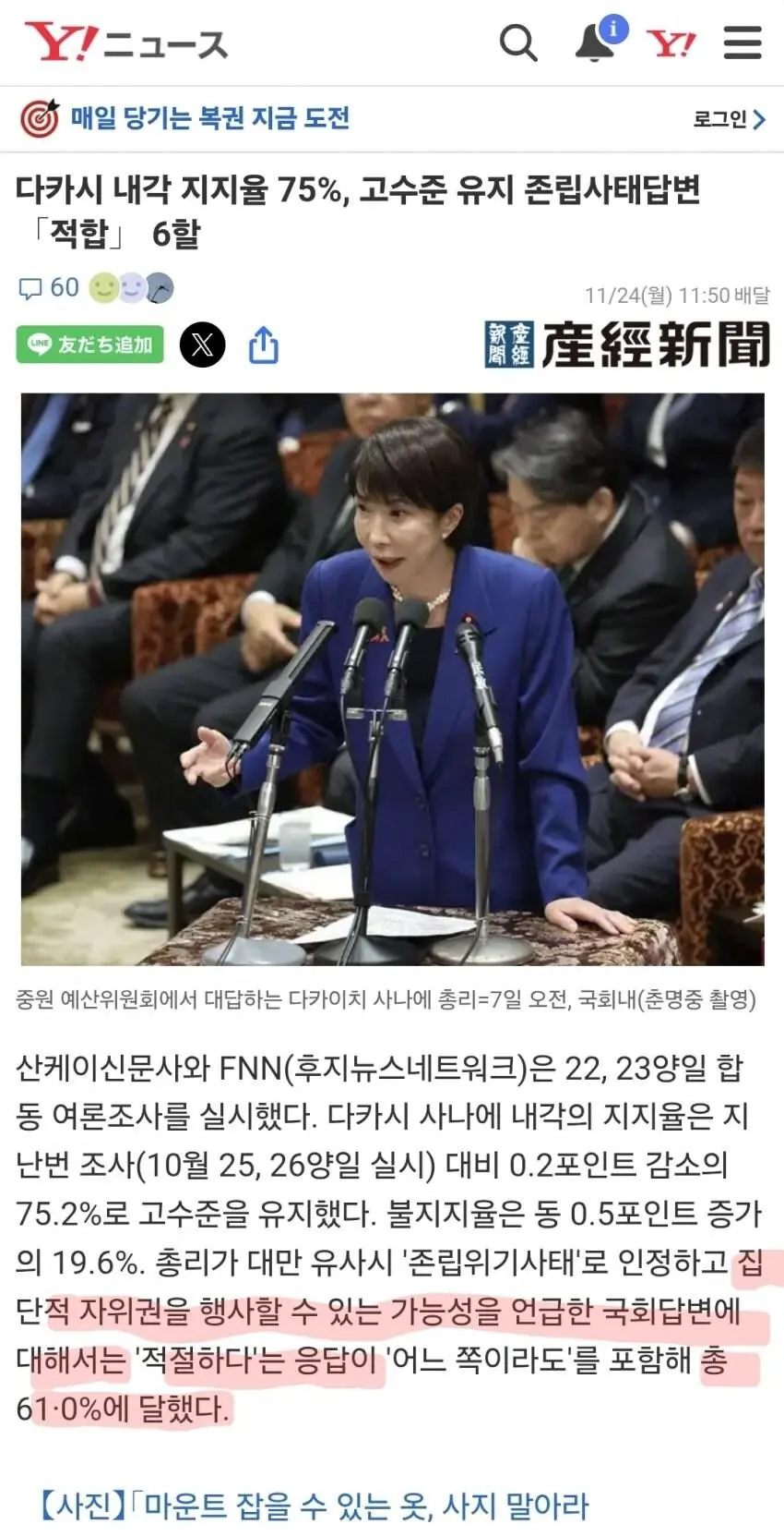 속보) 일본 다카이치 총리 지지율, 75% 돌파