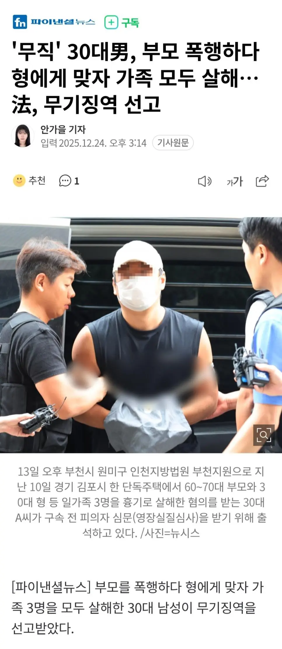 무직 30대 남성, 부모 폭행하다 형에게 맞자 가족 모두 살해