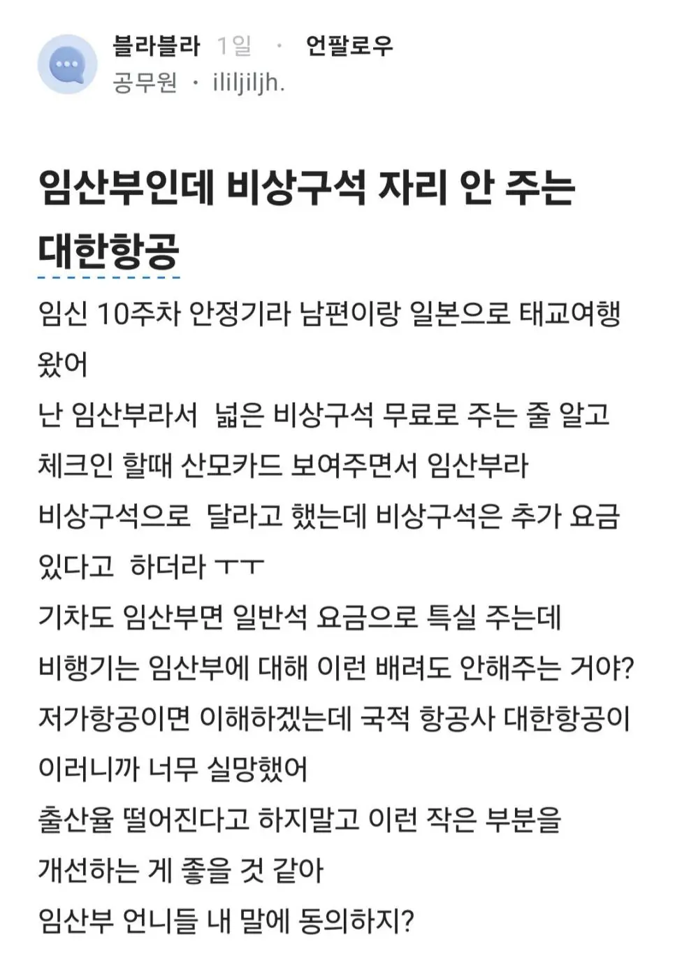 임산부인데 비상구석 자리 안 주는 대한항공.blind