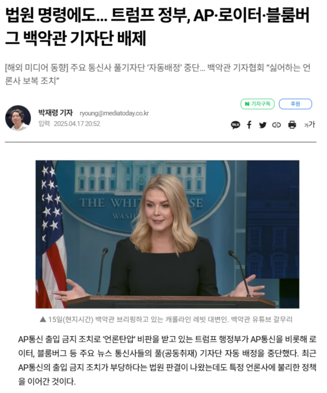 캐럴라인 레빗 대변인은 15일 “백악관이 기자단 구성에 대한 일시적인 재량권을 가질 것”이라며 “대통령의 메시지가 청중들에게 잘 전달되고 해당 주제에 대한 전문성을 갖춘 언론사가 상황에 맞게 참석할 수 있도록 하기 위한 조치”라고 말했다.