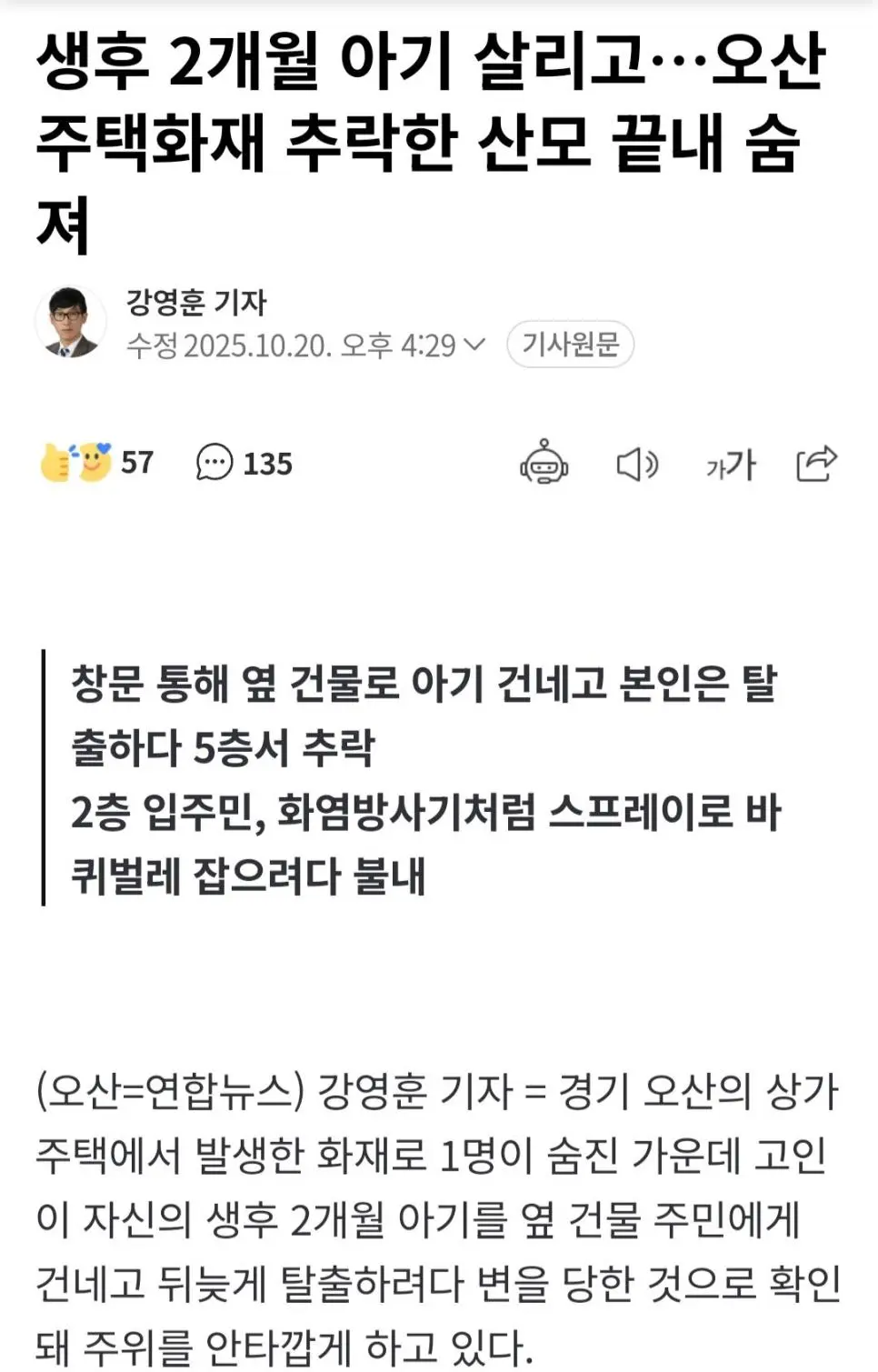 생후 2개월 아기 살리고 추락한 산모 끝내 숨져..