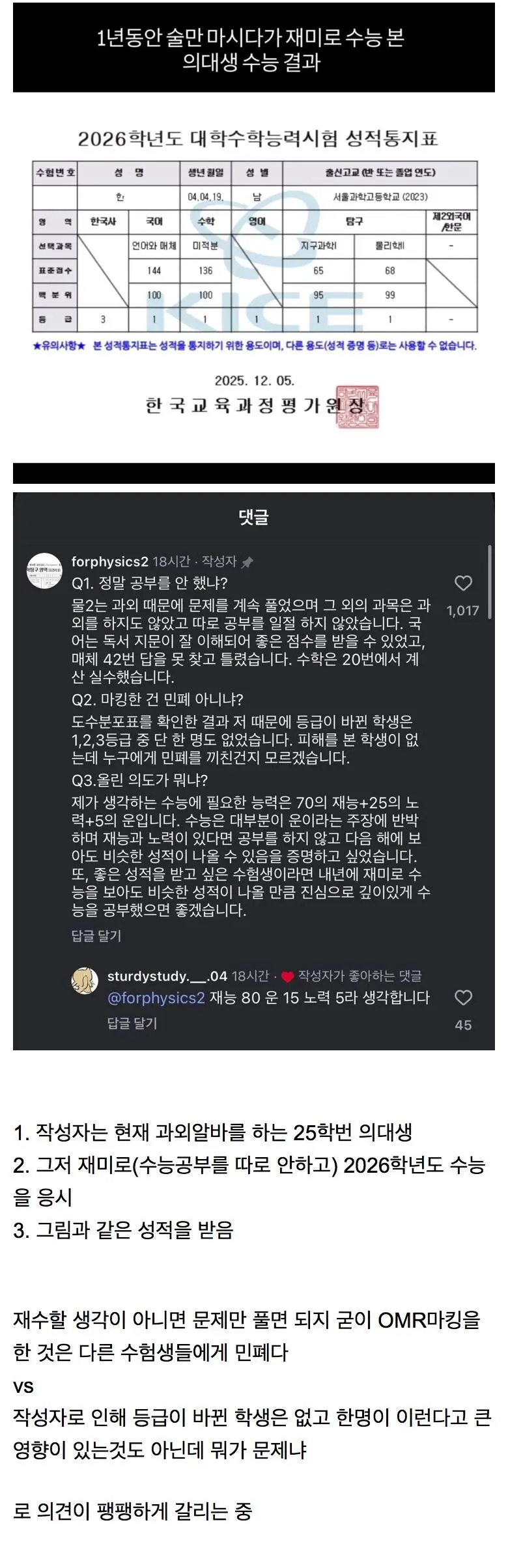 의대생이 재미로 수능 치고 1등급 맞아서 논란