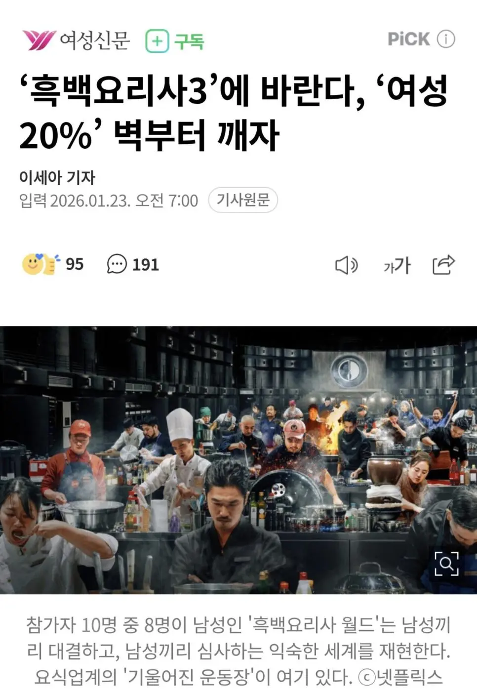 ‘흑백요리사3’에 바란다, ‘여성 20%’벽부터 깨자