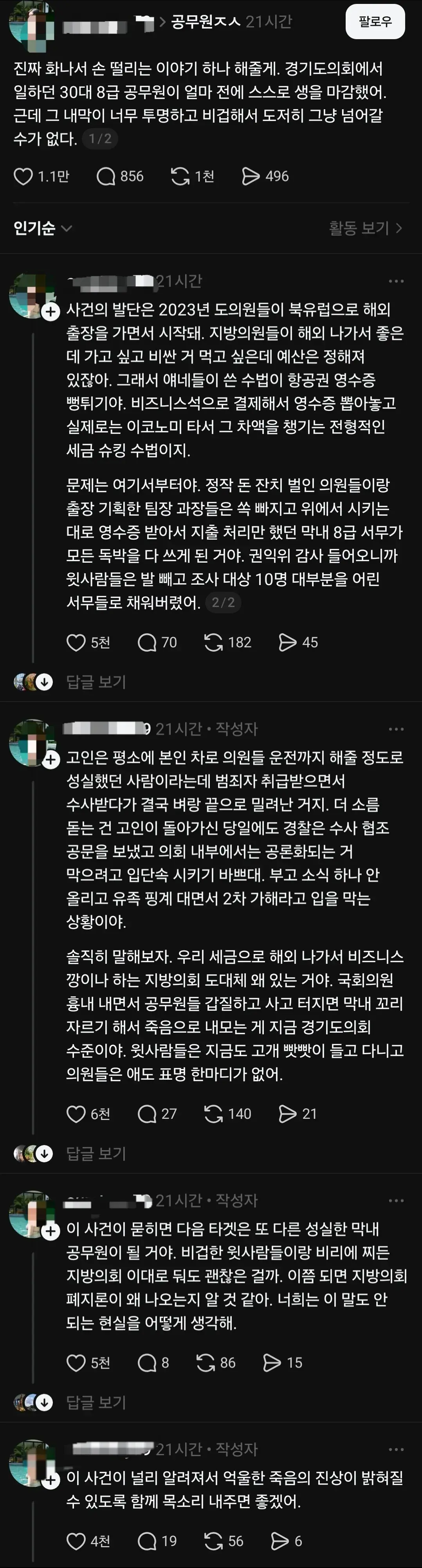 경기도의회 8급 공무원 자살 관련 스레드 글