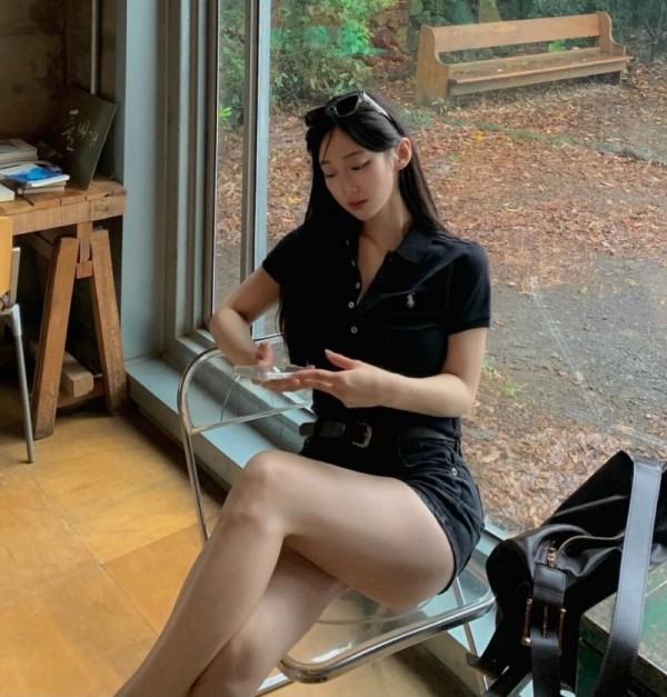 다리 꼬고 사진 찍는 누나